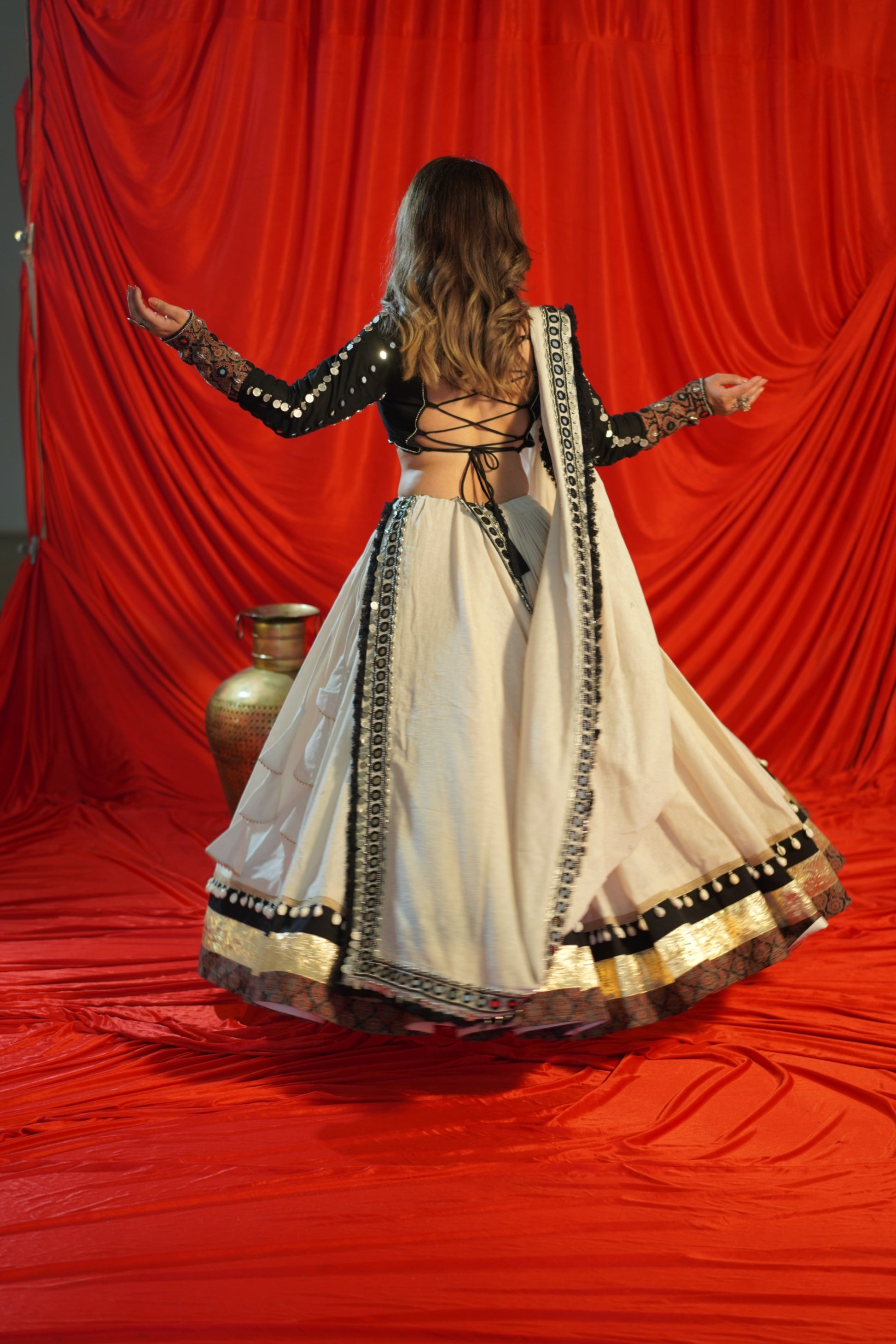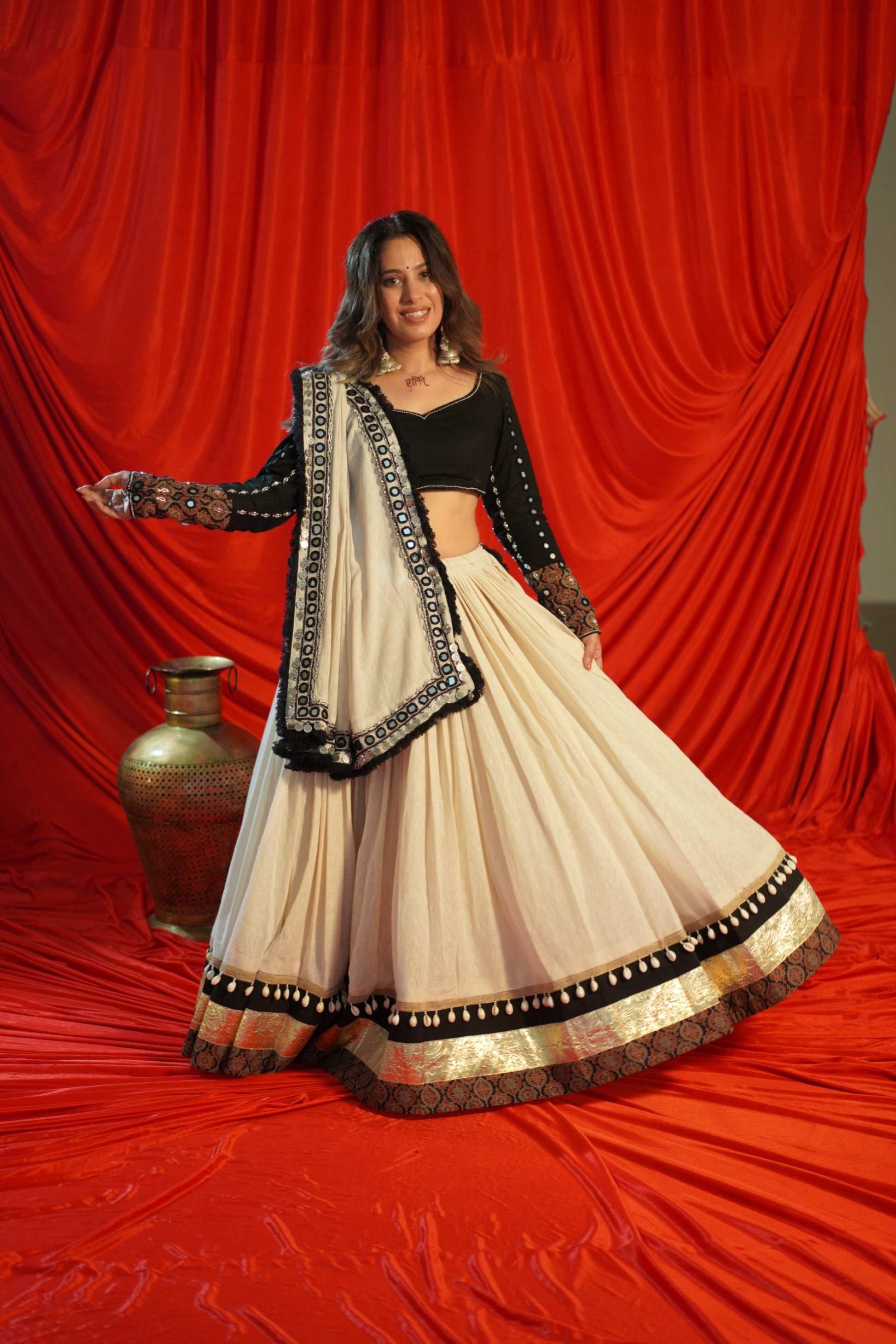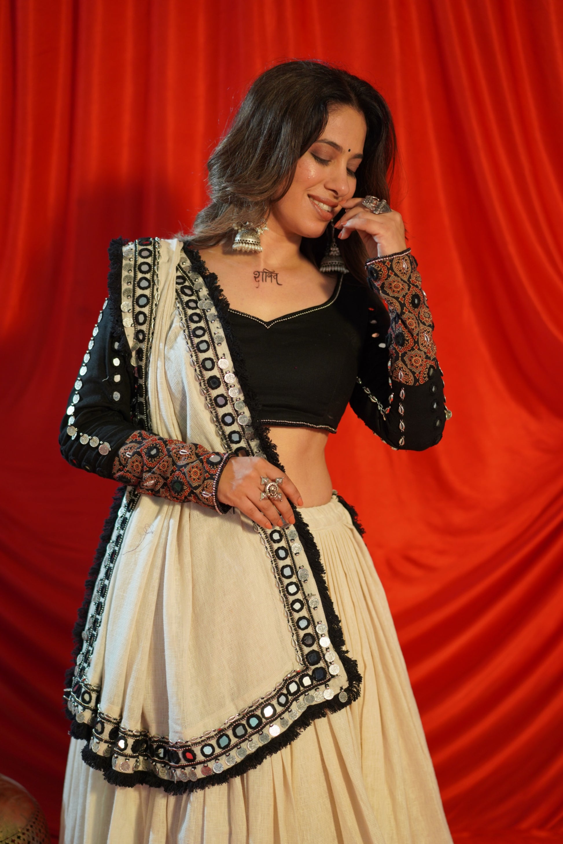 Black & Ivory Jute Navratri Chaniya Choli Set with Boho Mirror Dupatta – GlamGirl Raas2025 Exclusive