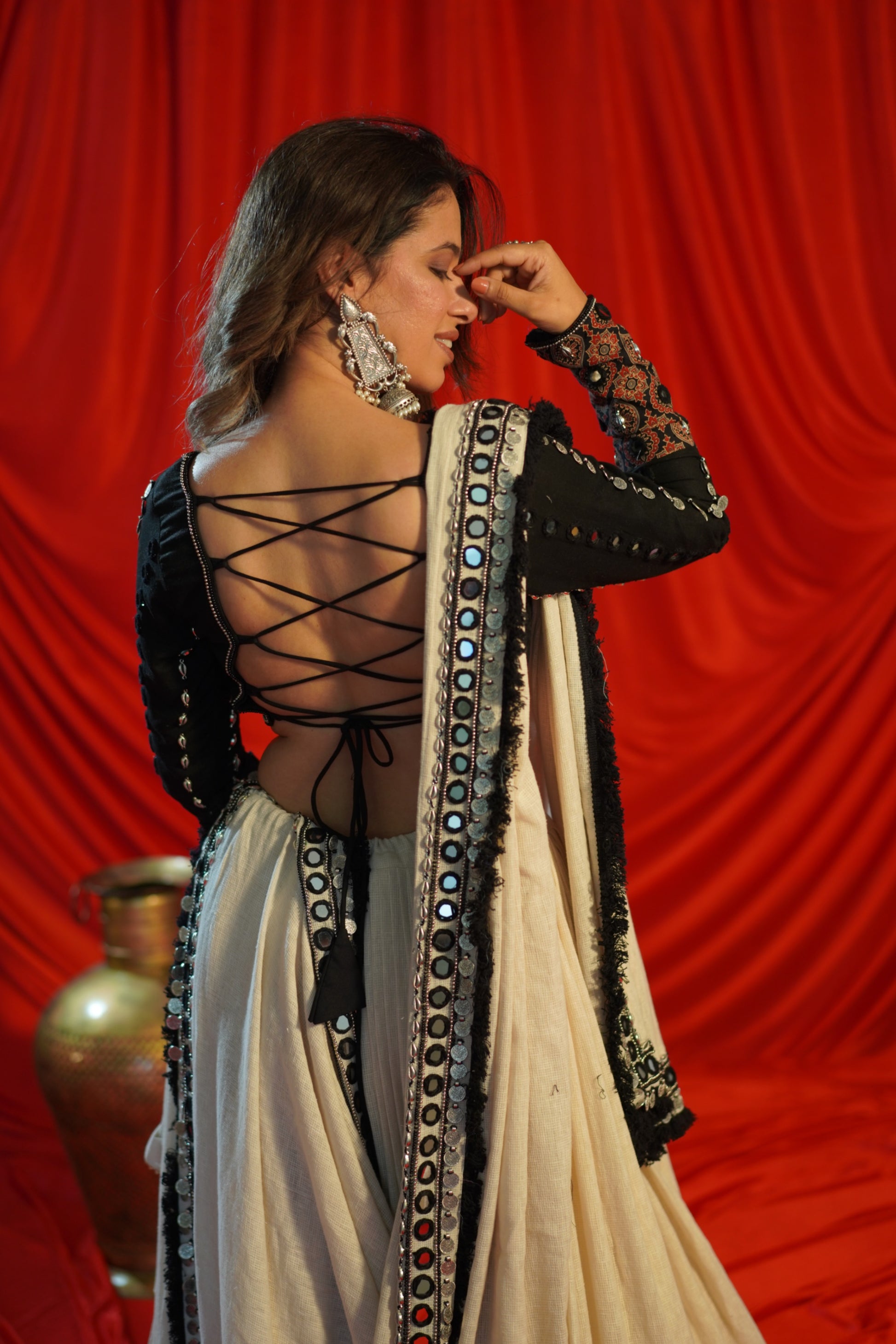 A sleek black full-sleeved blouse that serves drama and detail. Embellished with hand mirror work, metal coins, and Ajrakh-patterned cuffs, it adds depth and definition to your Navratri look, while the neckline stays minimal for a balanced silhouette.