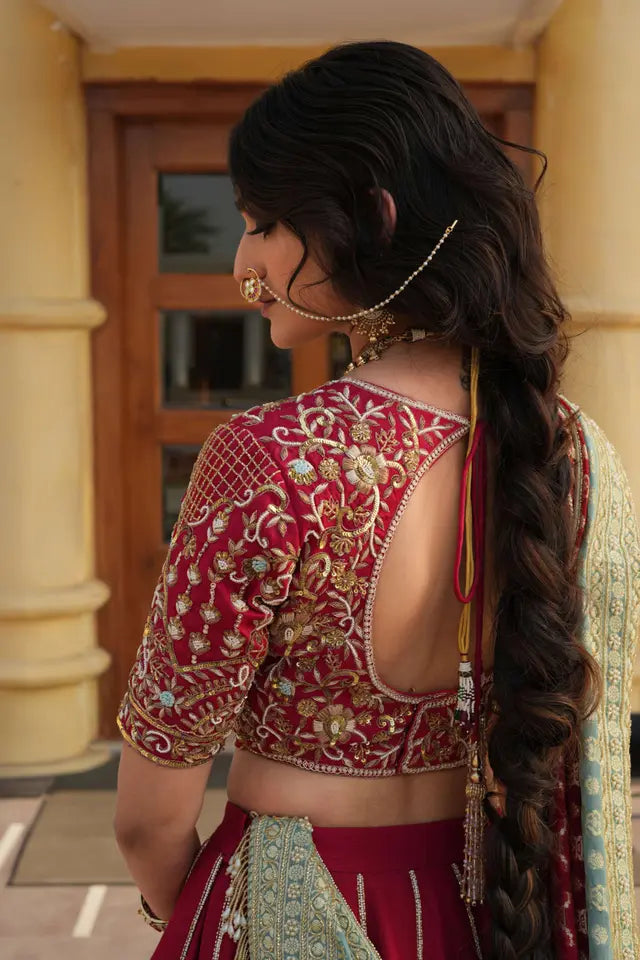 Dupatta: Pure monga silk dupatta adorned with elegant handwork embellishments, showcasing a shaded blend of red and sky hues.