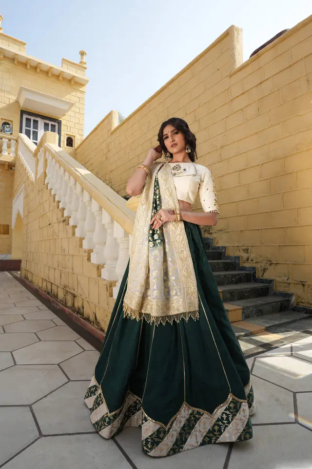 Dupatta: Pure monga silk dupatta adorned with exquisite handwork embellishments, featuring a shaded blend of dark green and off