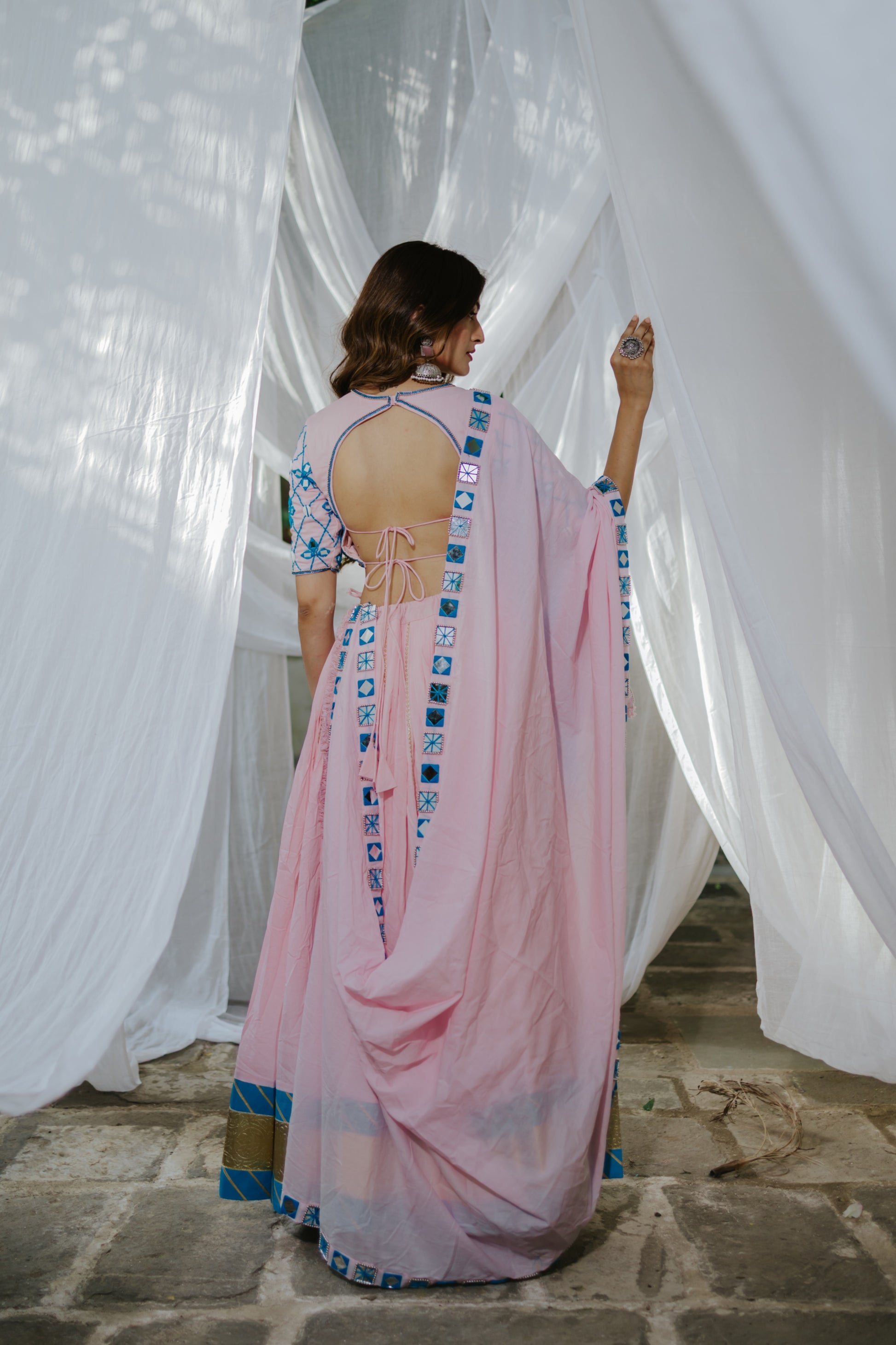 Crafted in soft mulled cotton, this 10-meter flare baby pink skirt offers dreamy movement and luxurious comfort. The border features vibrant sky blue and antique gold bands, evoking festive royalty with every twirl.
