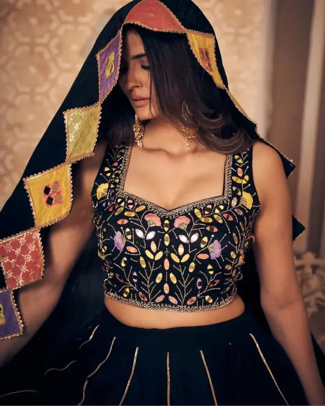 outfit : Blake raw silk lehenga, adorned with delicate eplic Chanderi and mirror work. The blouse features intricate handwork, paired with a luxurious organza silk dupatta.