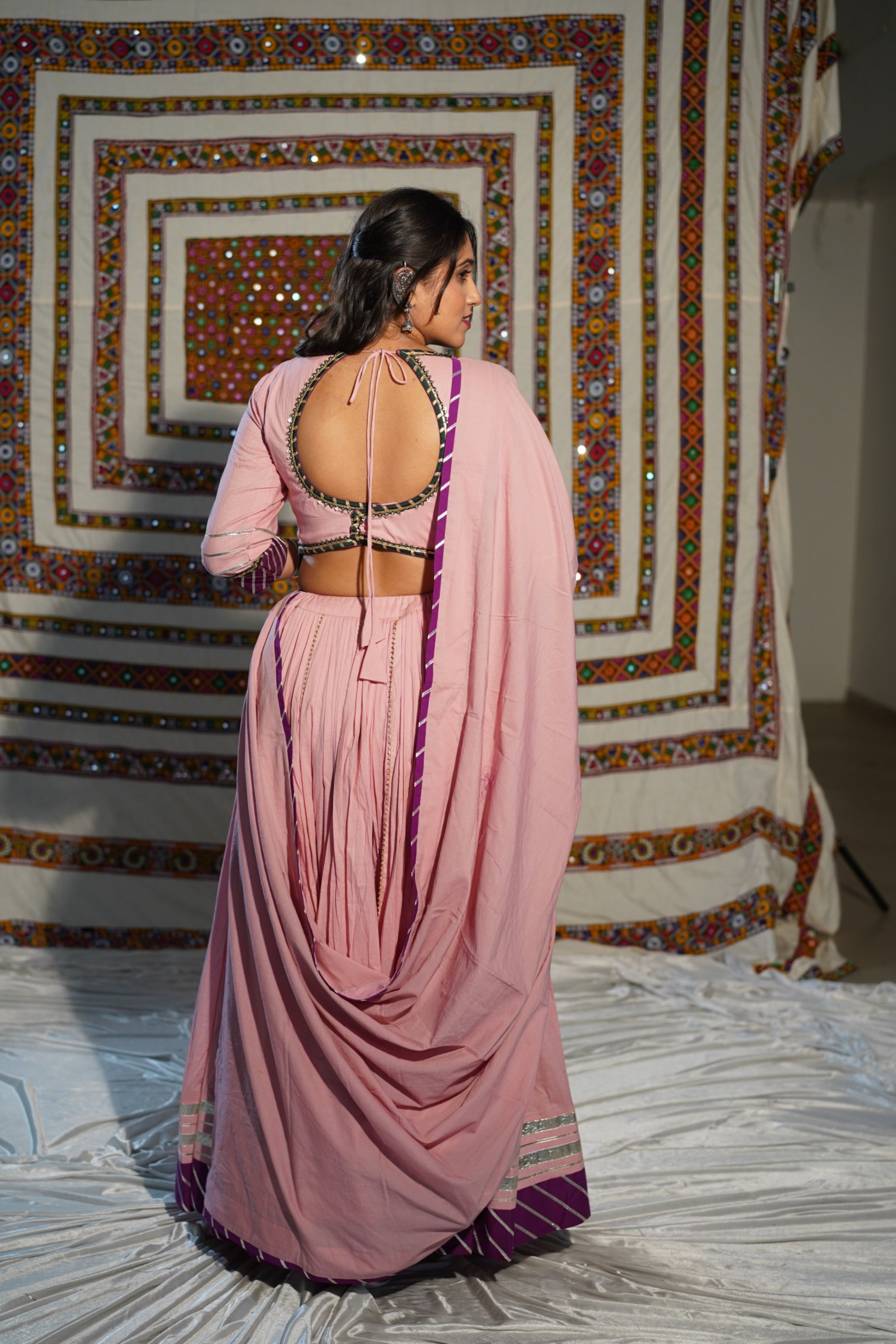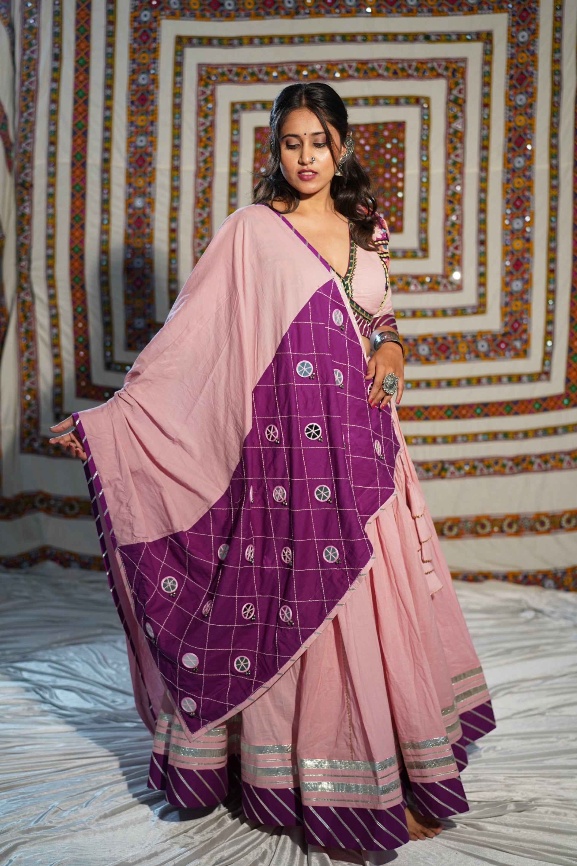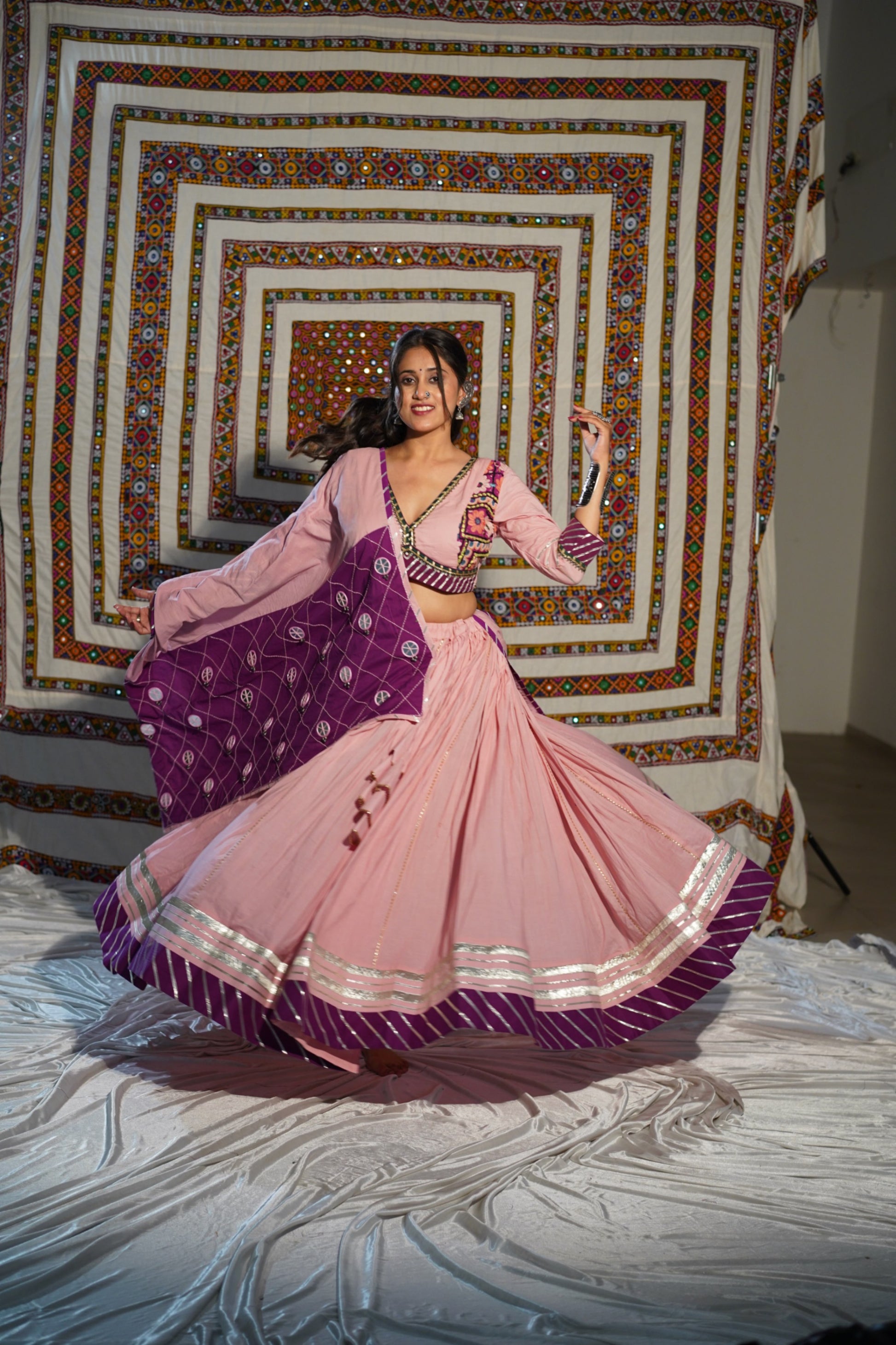 • Skirt (Chaniya): Featuring a magnificent 10–12 meter flair, the English pink chaniya is finished with a striking wine-colored hemline and elegant silver gota detailing. The flowy cotton fabric ensures comfort during long Garba nights.