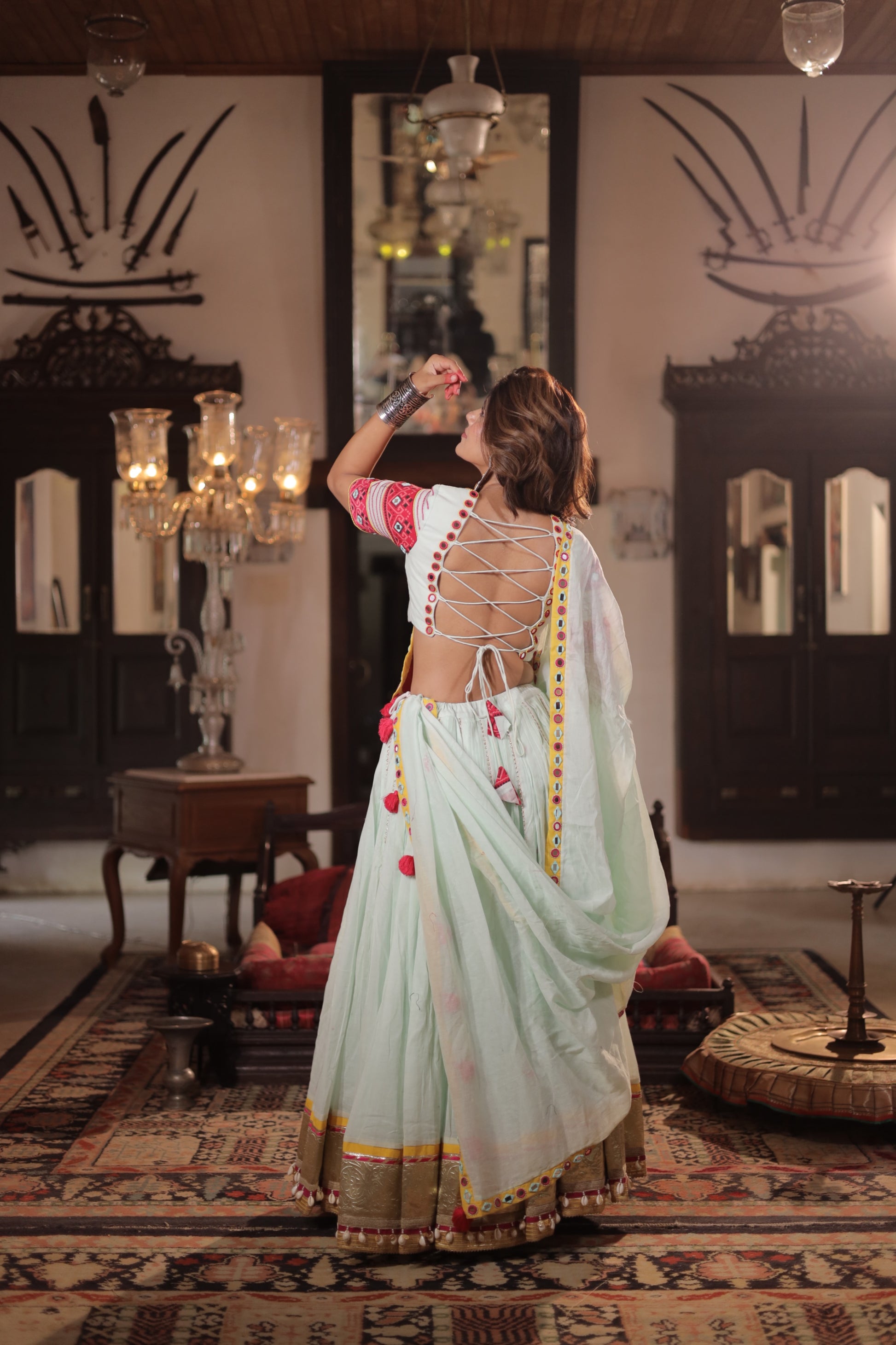 A true show-stealer, this Daman-style dupatta is made in a light pista green base and features striking Patola-style paneling, enriched with mirror work and colorful thread embroidery. Finished with playful latkans and tassels, it brings a festive punch to the entire ensemble and gracefully complements the blouse and skirt.