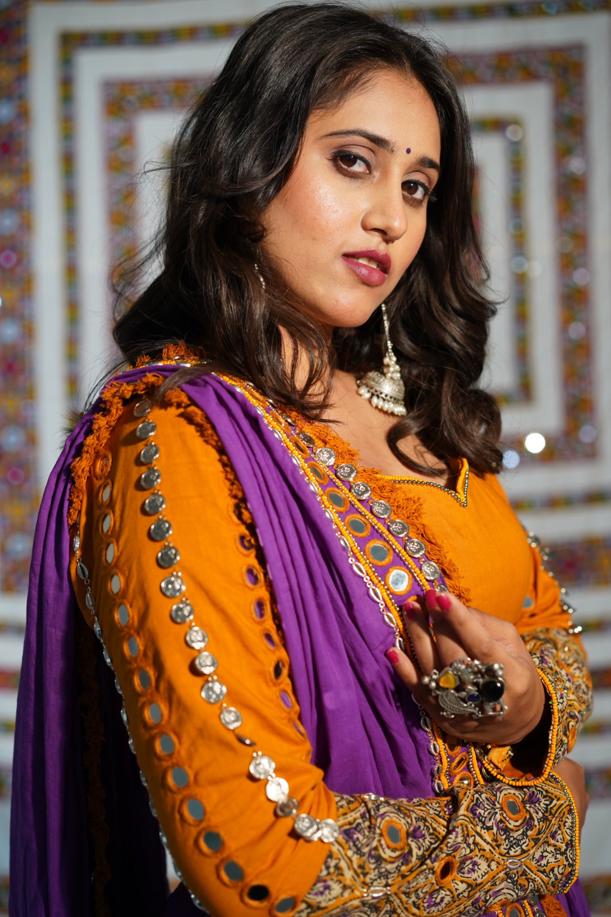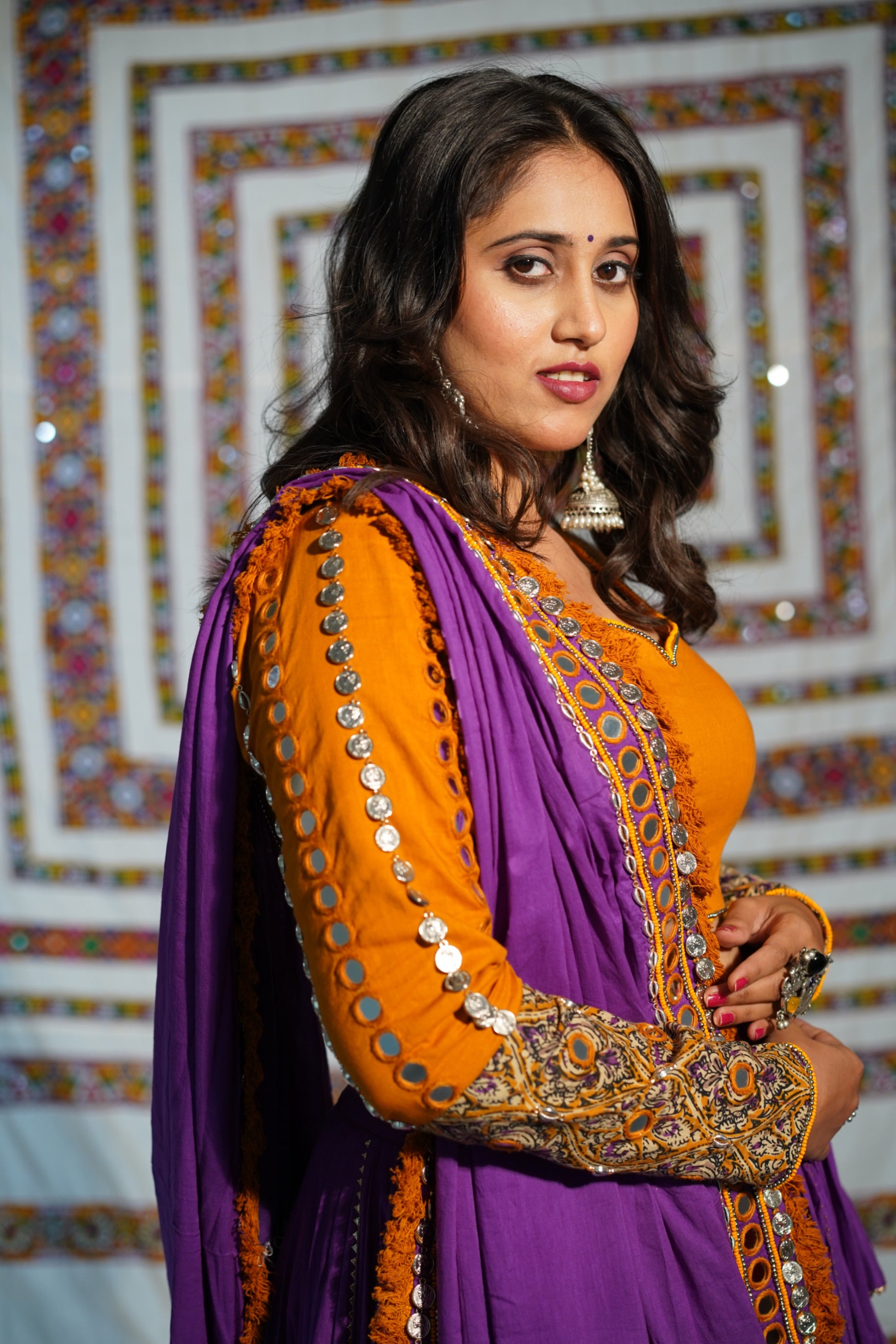 Crafted in soft mulled cotton, this rich purple flared skirt boasts an impressive 10 to 11 meters of ghera, perfect for graceful twirls during Garba nights. The hemline is beautifully finished with mustard Ajrakh printed borders, enhanced with metallic trims and thread work detailing for a bold yet rooted look.
