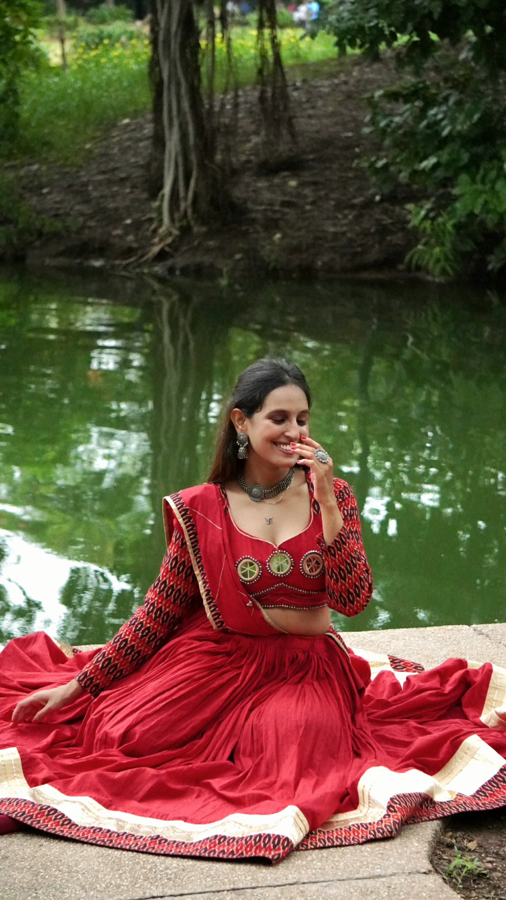 • Chaniya (Skirt): Crafted from soft mulmul cotton in a rich festive red, featuring a grand 12-meter flare for mesmerizing twirls. The hemline is adorned with a striking Ikat print border and highlighted with a gold accent for a regal touch.