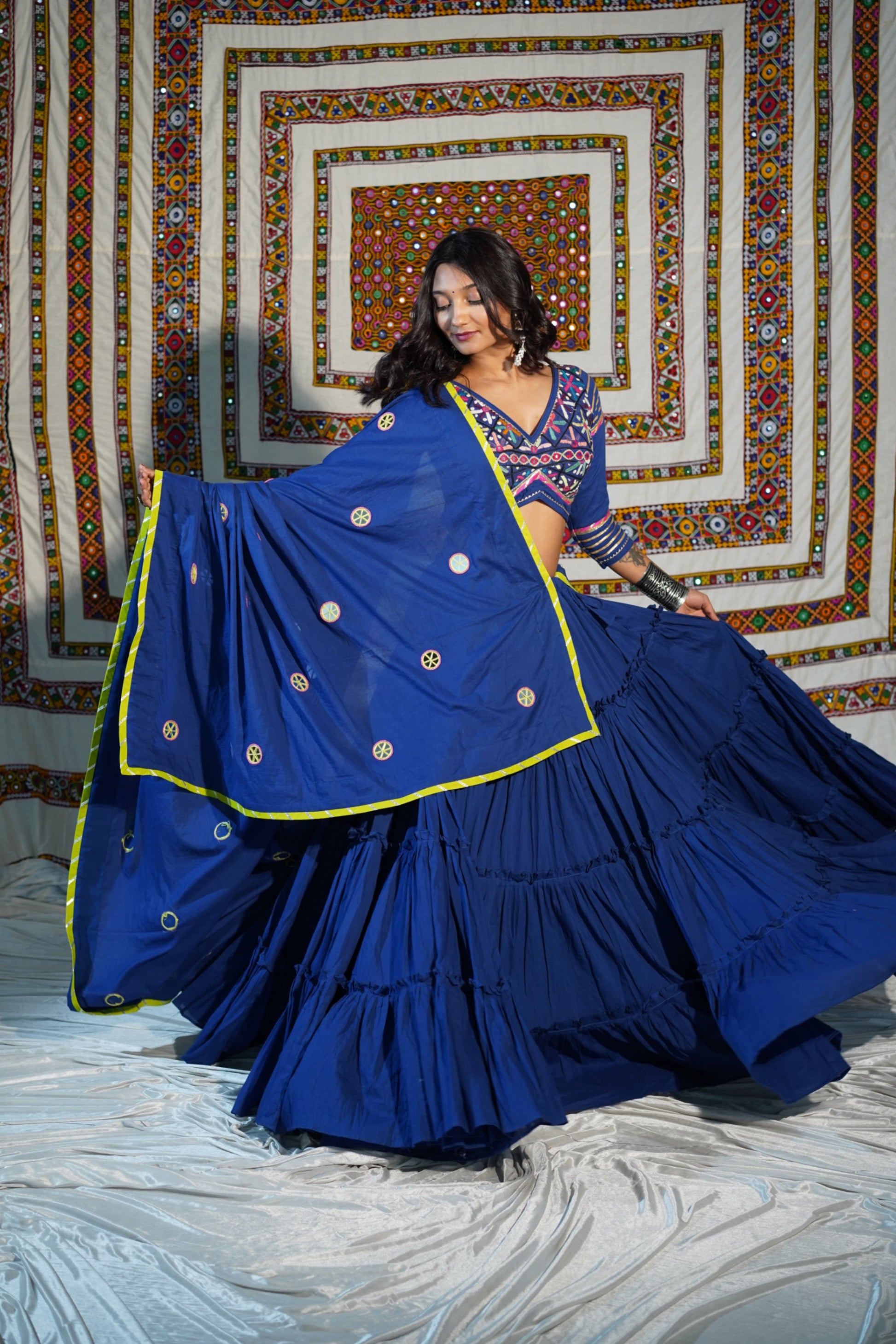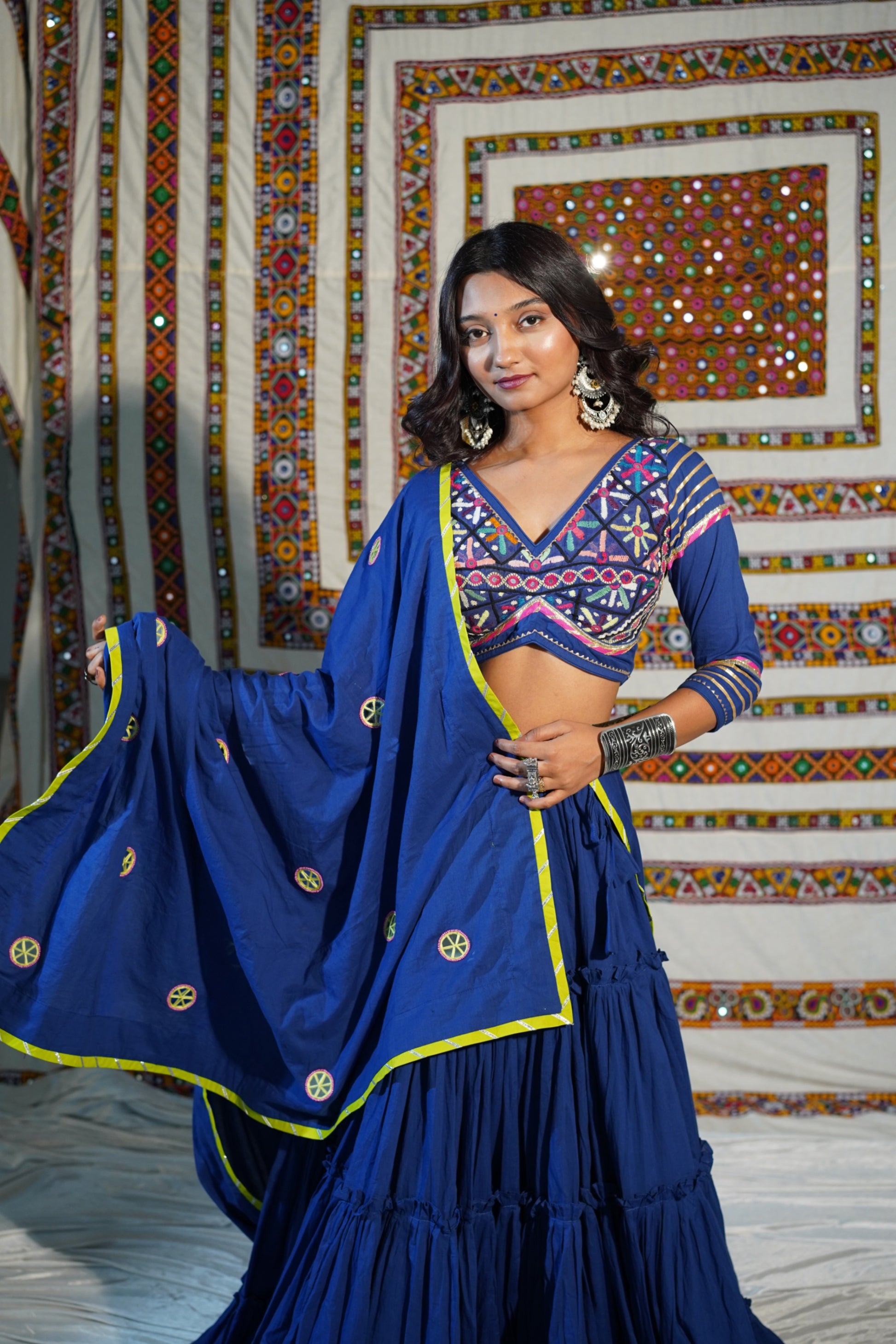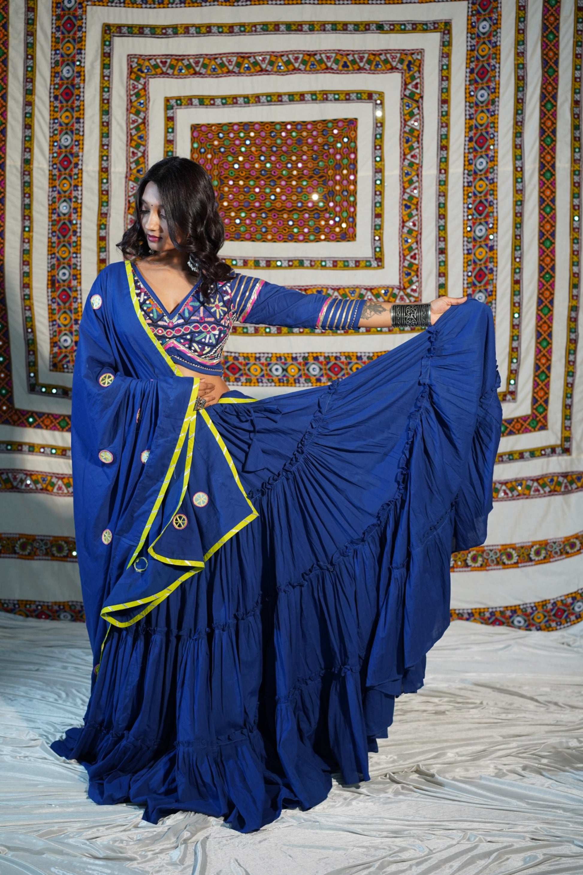 Royal Blue 18-Meter Flare Chaniya Choli with Kutchi Heritage Blouse & Mirror Kukri Dupatta – Navratri 2025