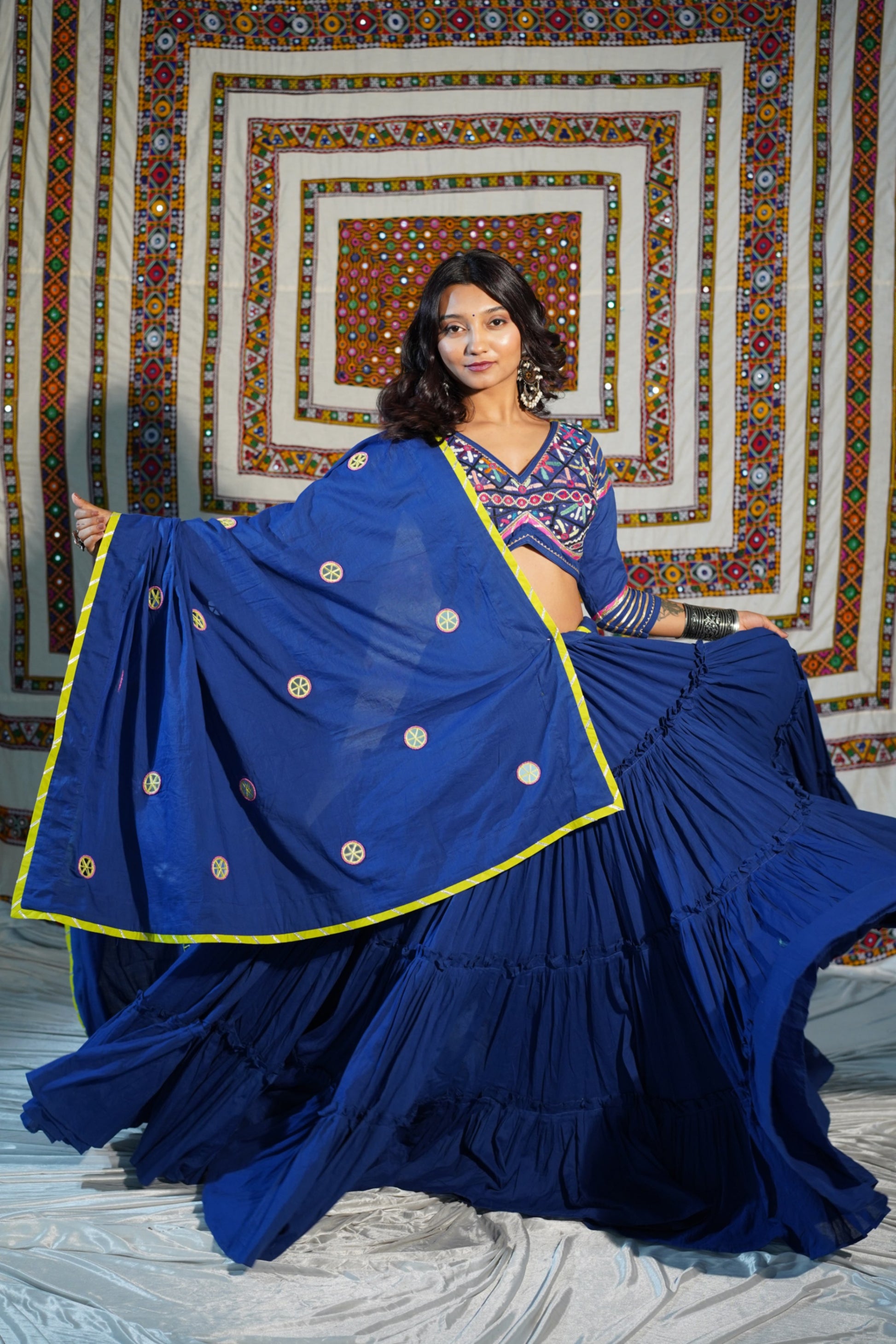 Celebrate the magic of Navratri in this exquisite royal blue Chaniya Choli set, a bold and graceful ensemble inspired by Gujarat’s timeless Kutchi heritage.