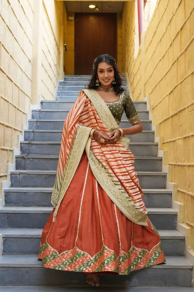 Fabric: Blouse: Raw silk, Dupatta: Pure Monga silk, Skirt: Raw silk and Chanderi silk.