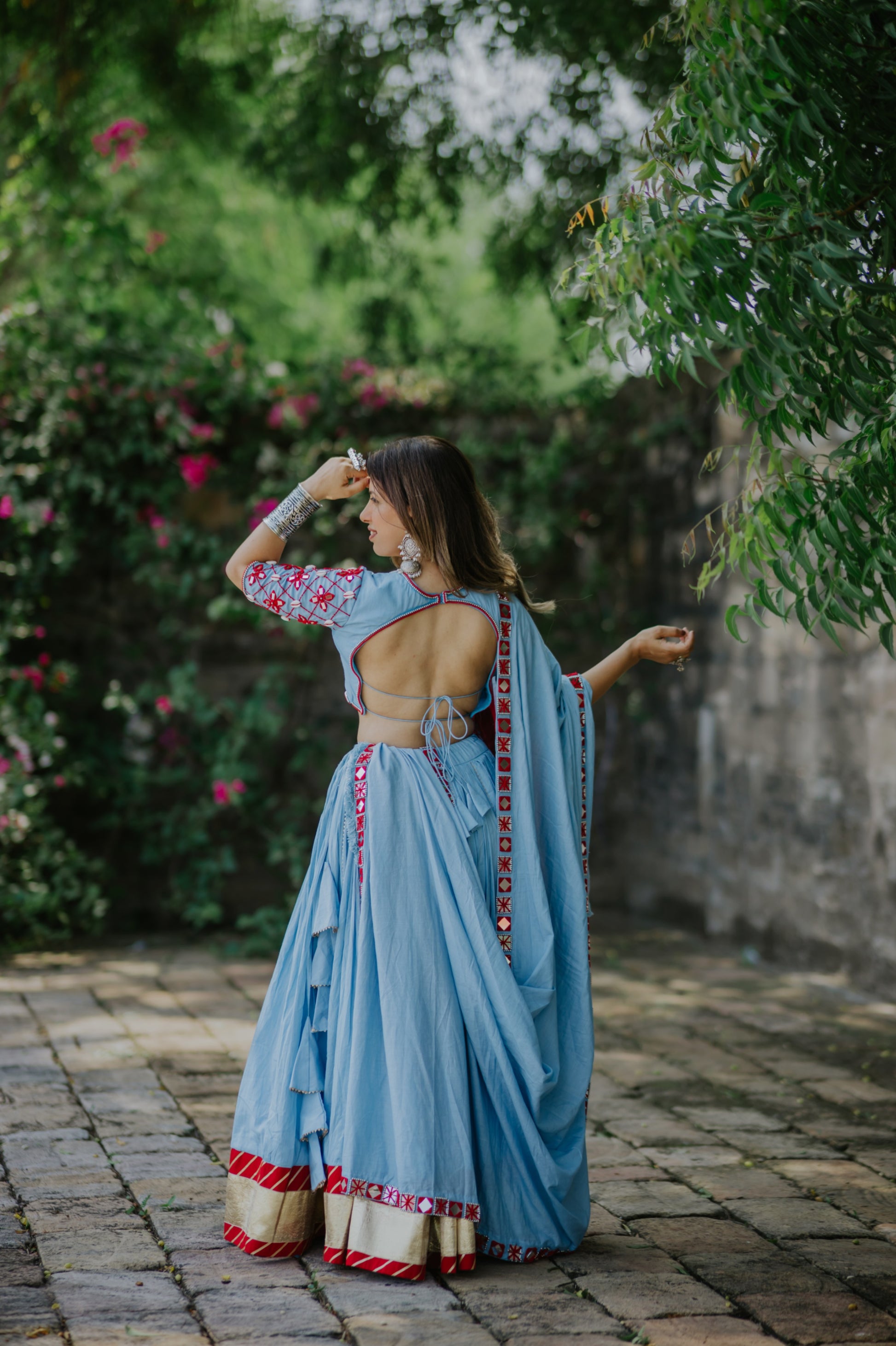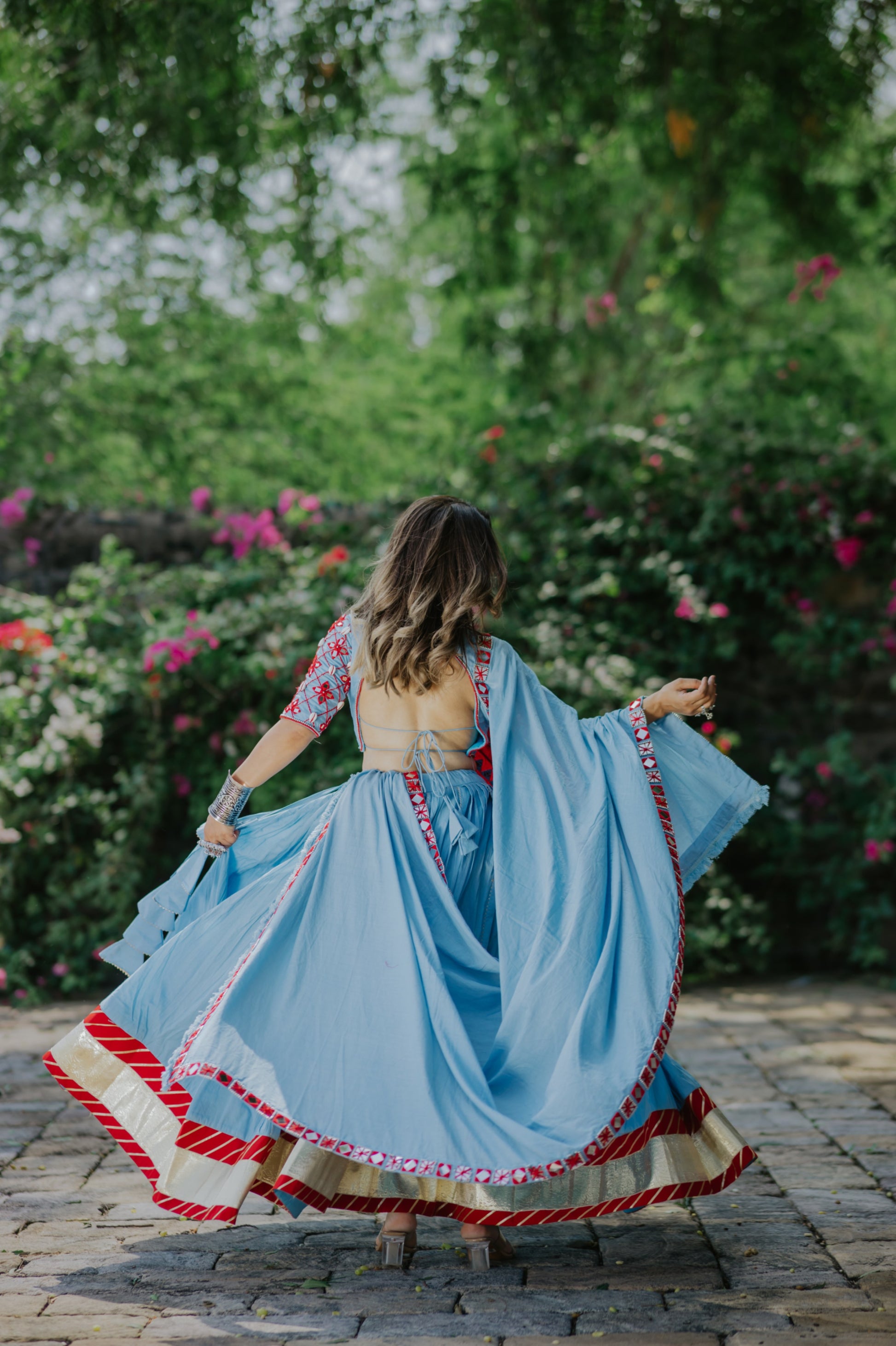 Crafted from soft, breathable malcotton fabric, the sky blue lehenga features a massive 10-meter flare for an effortless twirl-worthy movement. The hemline is accented with intricate red and gold detailing, adding just the right touch of festivity and richness. Lightweight, airy, and designed for long Garba nights.