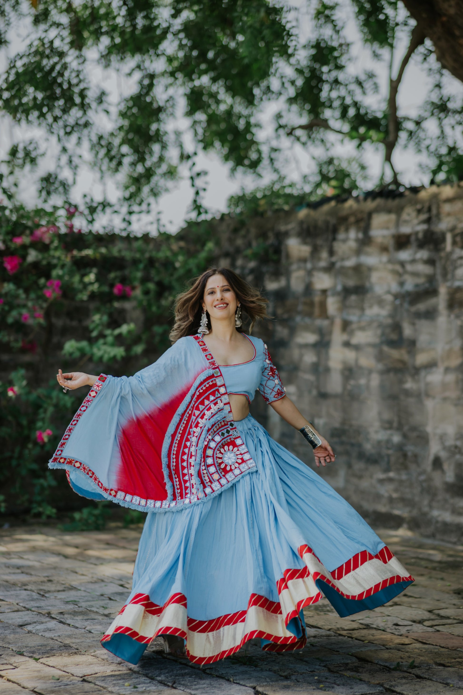 Sky & Red Ombré Navratri Chaniya Choli with Mirror Work Blouse & Boho Dupatta – Glam Girl Exclusive 2025